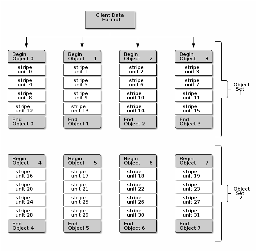 Stripe Count: The Ceph Client writes a sequence of stripe units over a series of objects determined by the stripe count. The series of objects is called an object set. After the Ceph Client writes to the last object in the object set, it returns to the first object in the object set.