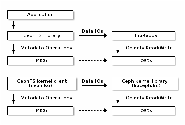 To read/write a CephFS file, client needs to have ‘file read/write’ capabilities for corresponding inode. If client does not have required capabilities, it sends a ‘cap message’ to MDS, telling MDS what it wants. MDS will issue capabilities to client when it is possible. Once client has ‘file read/write’ capabilities, it can directly access RADOS to read/write file data. File data are stored as RADOS objects in the form of <inode number>.<object index>. See ‘Data Striping’ section of Architecture for more information. If the file is only opened by one client, MDS also issues ‘file cache/buffer’ capabilities to the only client. The ‘file cache’ capability means that file read can be satisfied by client cache. The ‘file buffer’ capability means that file write can be buffered in client cache.